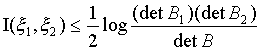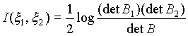 В случае, когда x 1 и x 2 образованы конечным числом гауссовых величин: x 1={x (1),., x (m)}, x 2 = {x (m+1),., x (m+n)}, причем корреляционная матрица B общей совокупности x (1),., x (m+n) является невырожденной, количество информации I(x 1 , x 2) может быть выражено следующей формулой: