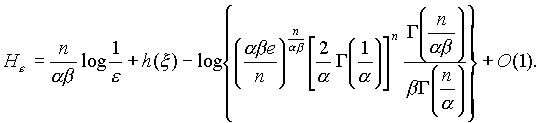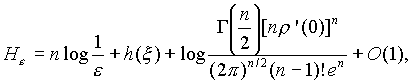 Пусть x = (x 1,.,x n) и h = (h 1,.,h n) - векторные случайные величины в n-мерном евклидовом пространстве X и r(x,y) - некоторая неотрицательная функция, определяющая условие близости величин x и h, которое выражается следующим соотношением: Mr(x ,h ) ё e . Величину H=H e , определенную как H e = inf I(x, h), обычно называют e-энтропией случайной величины x (нижняя грань берется по всем случайным величинам h, удовлетворяющим указанному условию e-близости случайной величине x). Пусть r(x,y) = r(|x-y|) и существует производная r'(0), 0< r'(0)<╔. Тогда при e ╝ 0 имеет место асимптотическая формула, в которой логарифмы берутся по основанию e: