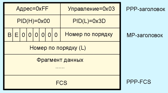 Поля PID - идентификатор протокола. Субполе B (Beginning) - бит фрагмента =1 для первого фрагмента PPP и =0 для всех последующих фрагментов. Субполе E (Ending) - бит фрагмента =1 для последнего фрагмента PPP и =0 для всех прочих фрагментов. Поле номер по порядку имеет длину 24 бита. Существует модификация пакета с укороченным кодом (12 бит) номера по порядку. При этом к этому полю отходят 4 нулевые бита после BE00. Выбор длины этого поля осуществляется протоколом LCP. Значение полу увеличивается на 1 при посылке очередного фрагмента. Для вышерасположенных уровней совокупность совместно используемых каналов выглядит, как один виртуальный канал.
