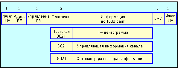 Протокол PPP (Point-to-Point Protocol; RFC-2716, -2701, -2688, -2687, -2686, -2615, -2516, -2509, -2508, -2507, -2484, -2472, -2433, -2420, -2419, -2364, -2363, -2290, -2284, -2153, -2125, -2097, -2043, -1994, -1993, -1990, -1989, -1979, -1978, -1977, -1976, -1975, -1974, -1973, -1969, -1968, -1967, -1963, -1962, -1915, -1877, -1841, -1764, -1763, -1762, -1663, -1662, -1661, -1638, -1619, -1618, -1598, -1570, -1552, -1378, -1377, -1334, -1332, -1331, и STD-51, cмотри также www.spitbrook.destek.com:81/pptp.txt) предназначен для решения тех же задач, что и SLIP, но лишен многих его недостатков, он служит для передачи мультипротокольных дейтограмм от одного узла к другому. Сам по себе список RFC, приведенный выше, впечатляющ. Он говорит о том, что данный протокол относится к числу наиболее важных и широко используемых. Это и понятно, большинство региональных сетей строится с использованием соединений точка-точка. PPP поддерживает, как асинхронный режим с 8 битами данных без бита четности (согласуется со свойствами последовательного интерфейса, имеющегося практически на всех ЭВМ), так и побитовый синхронный режим. Протокол содержит в себе три составные части: