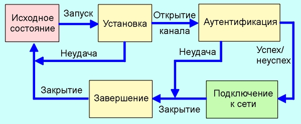 Протокол PPP при установлении соединения предусматривает процедуру аутентификации, которая является опционной (смотри рис. 3.5.2.). После перехода на сетевой уровень вызывается NCP-протокол, который выполняет необходимую конфигурацию канала.