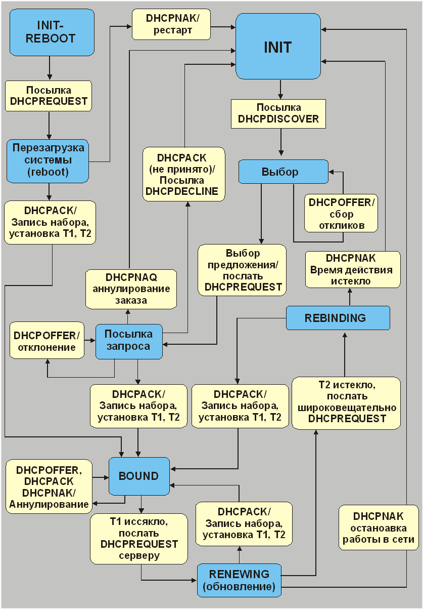 Если клиент обнаруживает, что IP-адрес в сообщении DHCPACK уже использован, клиент должен послать сообщение DHCPDECLINE серверу и повторно запустить процесс конфигурации, послав запрос на новый сетевой адрес. Это действие соответствует переходу клиента в состояние INIT на диаграмме состояния DHCP, которая описана в разделе 4.4. Если клиент получает сообщение DHCPNAK, он не может повторно использовать свой запомненный сетевой адрес. Он должен вместо этого запросить новый адрес путем повторного запуска конфигурационного процесса. Это действие соответствует переходу клиента в состояние INIT на диаграмме состояния DHCP. Клиент выполняет таймаут и повторно посылает сообщение DHCPREQUEST. Если клиент не получает ни сообщения DHCPACK, ни DHCPNAK, клиент, согласно алгоритму из раздела 4.1, повторно посылает сообщение DHCPREQUEST. Клиент должен выбрать число повторных передач сообщения DHCPREQUEST адекватным, чтобы обеспечить достаточную вероятность доступа к серверу, не заставляя клиента (и пользователя этого клиента) ждать слишком долго. Например, клиент, осуществляя повторную пересылку так, как это описано в разделе 4.1, может повторно передать сообщение DHCPREQUEST четыре раза при полной задержке 60 секунд, прежде чем повторно запустит процедуру инициализации. Если клиент после повторной пересылки не получил ни сообщения DHCPACK, ни DHCPNAK, он может решить использовать присвоенный ранее сетевой адрес и конфигурационные параметры вплоть до истечения срока их действия. Это соответствует переходу в состояние BOUND на диаграмме состояний клиента, показанной на рис. 5.