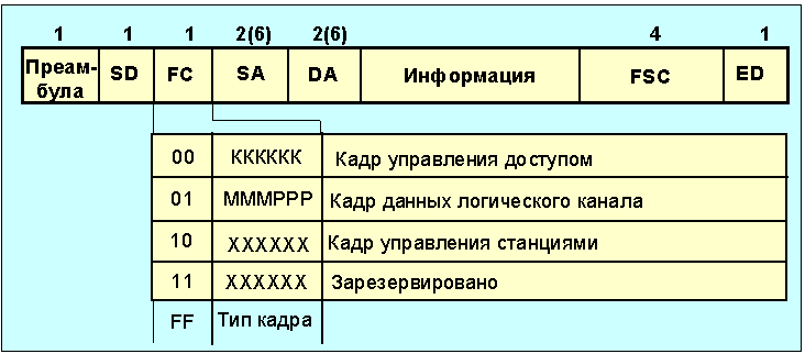 Рис. 4.1.3.1. Формат кадров 802.4. SD - (Start Delimiter) - стартовый байт-разделитель =**0**000, где * - символ, кодируемый неманчестерским кодом; FC - (Frame Control) поле управления кадром = FFxxxxxx, где FF - субполе формата кадра, а xxxxxx - биты типа кадра, SA и DA адреса отправителя и получателя, соответственно. FSC - (Frame Control Sequence) контрольная сумма (4 байта). ED - (End Delimiter) оконечный разграничитель =**1**11E (правый бит является 8-ым). MMM=000 - запрос, не требующий подтверждения; MMM=001 - запрос, требующий подтверждения, MMM=010 - отклик на запрос. PPP - биты приоритета (111 - высший приоритет, а 000 - низший). Значения кодов поля FC приведены в таблицах 4.1.3.1 и 4.1.3.2 (цифрами обозначен порядок передачи разрядов). Таблица 4.1.3.1. Коды поля FC