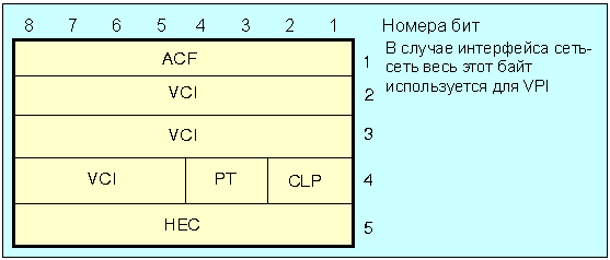 Рис. 4.1.9.2. Формат заголовка DQDB-пакета Поле ACF (access control field) служит для управления доступом. Поле VCI (virtual cannel identifier) - виртуальный идентификатор канала. Далее следуют поля: