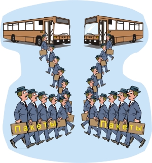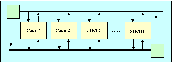 Рис. 4.1.9.3. Топология сети DQDB Каждый из узлов подключен к обеим шинам. По каждой из шин всегда циркулирует фиксированное число контейнеров. Содержимое контейнеров может передаваться с одной шины на другую. В сети DQDB используются следующие типы сегментов: