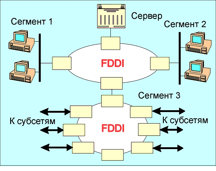 Рис. 4.1.6.7. Схема использования кольца FDDI для расширения пропускной способности локальной сети При обрывах оптоволокна возможно частичное (при двух обрывах) или полное (при одном обрыве) восстановление связности сети.