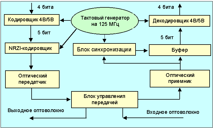 Рис. 4.1.6.2. Схема протокольных подуровней для FDDI Уровень MAC (media access control) определяет доступ к сетевой среде, включая формат кадров, адресацию, алгоритм вычисления crc и механизм исправления ошибок. Уровень PHY (physical layer protocol) задает процедуру кодирования/декодирования, синхронизацию, формирование кадров и пр. В качестве базовой используется кодировка 4b/5b (преобразование 4-битного кода в 5-битный), а в канале - NRZI. Уровень PMD (physical layer medium) определяет характеристики транспортной среды, включая оптические каналы, уровни питания, регламентирует частоту ошибок, задает требования к оптическим компонентам и разъемам. Блок схема интерфейса между уровнями MAC и PHY показана на рис. 4.1.6.3.