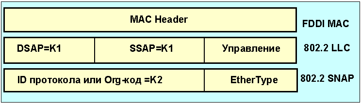 Рис. 4.1.6.4. Структура некоторых полей заголовков пакетов Полная длина LLC- и SNAP-заголовков составляет 8 октетов. Десятичное значение k1 равно 170 . Для преобразования 16- или 48-разрядного FDDI-адреса в 32-разрядный IP-адрес используется протокол ARP. Операционный код равен 1 для запроса и 2 для отклика. Спецификация FDDI MAC определяет максимальный размер кадра равным 4500 октетам, включая 16-октетную преамбулу. Преамбула состоит из кодов 11111, стартовый разделитель имеет вид 1100010001, а оконечный разделитель - 0110101101 (во всех случаях применена 5-битовая нотация). Контрольная сумма CRC вычисляется для полей, начиная с поля управление по данные включительно.