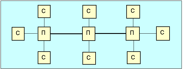 Рис. 4.1.7.1. Пример топологии сети hippi (П - переключатели, С - станции) HIPPI предполагает передачу данных по медному кабелю (или оптическому волокну) только в одном направлении по схеме связи точка-точка, но два канала HIPPI могут обеспечить и двунаправленный обмен данными. Передающий кабель может содержать 50/100 скрученных пар или соответствующее число оптических волокон. Длина пакета данных может варьироваться. Протокол HIPPI рассчитан на работу в реальном масштабе времени при суммарных длинах кабелей до десятков километров. Стандартный блок данных содержит 256 слов (1024 или 2048 байт). Для контроля корректности передачи предусмотрен контроль по четности для каждого байта на шине, кроме того, для каждого блока данных вычисляется "продольная" контрольная сумма (LLRC - length/longitudinal redundancy checkword). На рис. 4.1.7.2 показана схема передачи данных в рамках протокола HIPPI. На каждое соединение может быть передано любое число пакетов, пакет в свою очередь может содержать любое число блоков. Время между пакетами не регламентировано и может меняться, оно зависит от потока данных и протокола верхнего уровня.