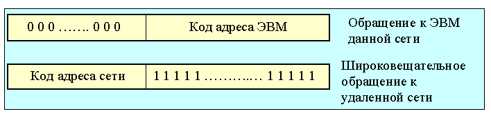 Рис. 4.1.1.3.2.а. Специальные ip-адреса IP-адрес имеет Интернет- и местную секции, первая характеризует место (организацию, сеть или даже группу сетей), вторая - конкретную ЭВМ. Местная секция адреса может быть разделена на части, характеризующие локальную сеть и конкретную ЭВМ (рис. 4.1.1.3.3).