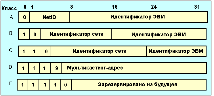 Рис. 4.1.1.3.2. Структура IP-адресов (NetID = идентификатор сети) Для удобства чтения IP-адреса обычно записываются в десятично-точечной нотации, например: 192.148.166.129 (адрес класса C). Классу A соответствует диапазон адресов 1.0.0.0 - 127.255.255.255. Ряд адресов является выделенными для специальных целей: 0.0.0.0 - обращение к ЭВМ, на которой производится работа;