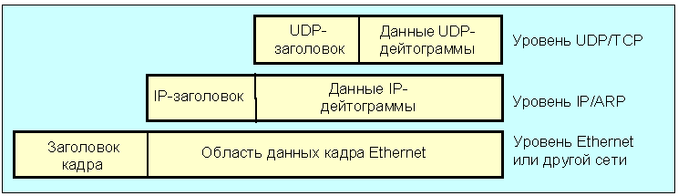 Рис. 4.1.1.3.4. cхема вложения пакетов в TCP/IP (в данном примере в поле тип Ethernet кадра будет записан код 0800) Отдельные сети в Интернет соединяются друг с другом через узловые серверы (gateway, их иногда называют пограничными маршрутизаторами - boarder gateway), расстояние между которыми может измеряться метрами или тысячами километров. В межсетевых обменах также используется принцип вложения так пакеты Ethernet могут вкладываться в пакеты FDDI и т.д.. Прикладные программы также как и все протокольное программное обеспечение уровня Интернет и выше работают только с ip-адресами, в то время как уровень сетевого программного обеспечения работает с физическими сетевыми адресами (так Ethernet использует 48-битные адреса). Обычно при описании сетей используется терминология 7-уровневой модели ISO ("стек протоколов"). Так уж получилось, но Интернет лишь с определенными натяжками можно описать, придерживаясь этой схемы. Ethernet инкапсуляция (RFC 894) (размеры полей указаны в байтах)