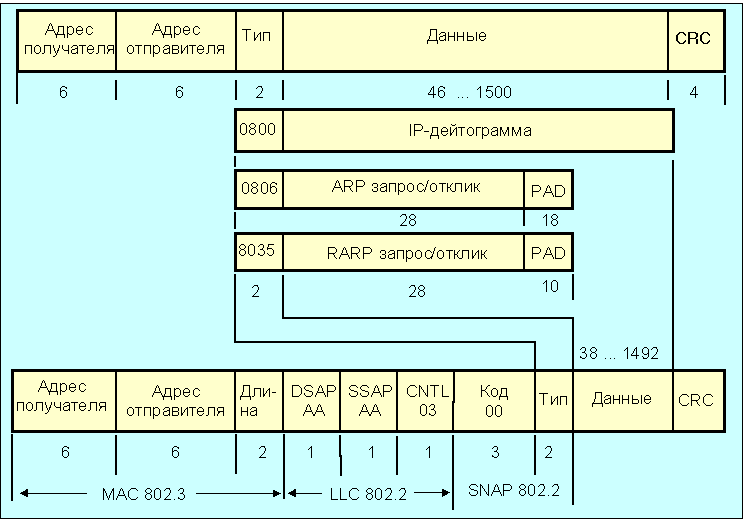 Рис. 4.1.1.3.6. Структура адресов DSAP и SSAP Поле CNTL может иметь длину 1 или 2 байта, а его структура соответствовать I, S или U-форматам (см. разделы "Эталонная модель iso" и "x.25"). В однобайтовых полях DSAP и SSAP записывается код типа протокола сетевого уровня. Для протоколов IPX/SPX это и последующее поле содержат код 0xE0. Поле CNTL=03 обозначает нечисловой формат для уровня ethernet 802.2. Эти три байта часто представляют собой код производителя, как правило, совпадающий с первыми тремя байтами адреса отправителя. Иногда они просто делаются равными нулю. Поле тип (2 байта) характеризует используемую версию Ethernet. Из рисунка 4.1.1.3.5 видно, что первые два поля (адреса получателя и отправителя) и последнее поле (CRC) во всех форматах идентичны. При расчете CRC содержимое кадра рассматривается как двоичный полином. Производится деление этого кода на специальный образующий полином. Полученный остаток от деления дополняется по модулю один, результирующий код и считается контрольной суммой CRC. В поле адрес получателя может быть записан код 0xffffffffffff, что указывает на широковещательную адресацию кадра. Адрес отправителя такой код содержать не может. Третье поле может служить для выявления типа используемого протокола. Если в этом поле содержится число более 1500 (десятичное), это указывает на то, что данный кадр имеет формат Ethernet II, а само поле содержит не длину кадра а тип данных. Теперь, надеюсь, читателю понятно, почему кадр Ethernet 802.3 не может содержать более 1500 байт. Кадр Ethernet 802.2 помимо первых трех полей содержит дополнительные три однобайтовые поля, следующие вслед за ними (DSAP, SSAP и CNTL). Кадр Ethernet SNAP является модификацией кадра Ethernet 802.2. Для этого кадра коды полей dsap и ssap равны 0xAA (признак кадра Ethernet SNAP), код CNTL=03 (нечисловой формат), поле код организации (3 байта, характеризует организацию сети) равен нулю (для IPX/SPX), а двухбайтовое поле тип характеризует протокол высокого уровня. Для протоколов IPX/SPX в этом поле должен быть записан код 0x8138 (для ip - 0x0800, для arp - 0x0806, для rarp - 0x8035, а для Apple Talk - 0x809b). Таблица кодов протоколов приведена в приложении Базовые протоколы Интернет (см. также RFC-1700). Поля тип протокола и по смыслу и по содержанию идентичны для всех разновидностей кадра Ethernet (кроме ieee 802.3). Транспортный уровень должен воспринимать данные от нескольких пользовательских программ и пересылать их на более низкий уровень. Многоуровневые протоколы спроектированы так, чтобы слой N по месту назначения получал ту же самую информацию, что была послана слоем N отправителя. Прикладные программы также как и все протокольное программное обеспечение уровня Интернет и выше использует только IP-адреса (32 бита), в то время как уровень сетевого программного обеспечения работает с физическими сетевыми адресами (так Ethernet использует 48-битные адреса). Когда IP-дейтограмма попадает в ЭВМ, сетевое программное обеспечение передает ее программе IP-уровня. Если адрес места назначения совпадает с IP-адресом ЭВМ, дейтограмма принимается и передается на более высокий уровень для дальнейшей обработки. При несовпадении адресов дейтограмма уничтожается (переадресация дейтограмм для ЭВМ запрещена, это функция маршрутизатора). Хотя можно заставить ЭВМ выполнять задачи маршрутизации, с точки зрения Интернет-философии это плохая идея. Различные сети и каналы имеют разные скорости обмена и надежность передачи. Это оп