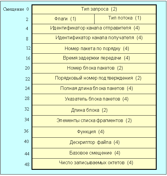 Рис. 4.2.1.10 Формат кадра пакетного режима В скобках на рисунке указаны размеры полей в байтах. Поле тип потока в данное время может содержать только код 0x02 и означает, что передаются длинные блоки пакетов. Поле идентификатор отправителя является случайным числом и представляет собой уникальный идентификатор канала, работающего в пакетном режиме. Код этого поля формируется отправителем и не должен равняться нулю. Идентификатор канала получателя также случайное число, но задается адресатом и также не должно содержать нуль. Поле номер пакета по порядку служит для отслеживания текущей пакетной операции и увеличивается на единицу для каждого нового пакета. Поле время задержки передачи означает величину задержки между отправкой пакетов и измеряется в сотнях микросекунд. Поле номер блока пакетов идентифицирует принадлежность пакета к конкретному блоку (данные, посылаемые по запросу, образуют один блок). При установлении связи код этого поля делается равным нулю. В дальнейшем при выполнении каждого запроса его значение увеличивается на 1. Поле порядковый номер подтверждения содержит номер блока пакетов, ожидаемый следующим. Поле служит для контроля доставки блоков пакетов. Поле полная длина блока пакетов задает длину блока в байтах и равно сумме длин всех пакетов в блоке. Поле указатель блока пакетов определяет положение конкретного пакета, указатель равный нулю говорит о том, что это первый пакет. Поле длина блока задает длину блока пакетов в октетах. Поле элементы списка фрагментов задает число элементов, пропущенных в процессе реализации пакетной сессии. Если это число равно нулю, пропущенных фрагментов не было. Поле функция определяет разновидность операции (чтение или запись), реализуемой в данной сессии. Последующие поля служат для операций с файлами. |
