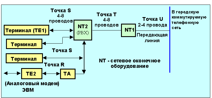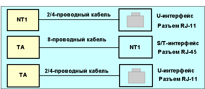 Рис. 4.3.3.2. Кабели и разъемы в каналах ISDN Точки s и t обеспечивают доступ к канальным услугам ISDN. В точке R (на рис. 4.3.3.2 TA - терминальный адаптер), в зависимости от типа терминального адаптера, доступны некоторые другие стандартные CCITT услуги (X.21 или X.25, V.35, RS-232 или V.24). Входы TE1 и TE2 предназначены для удаленных телекоммуникационных услуг. Все виды услуг могут быть разделены на три группы по форме доступа к 64кбит/с: