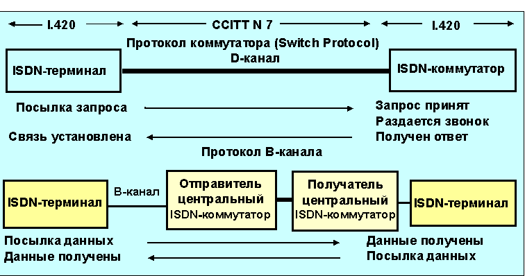 Следует обратить внимание на то, что базовый ISDN-канал содержит два В-канала по 64 кбит/c и один D-канал с 16 кбит/c. Первичный же isdn-канал содержит 24 или 30 стандартных В-каналов и один D-канал с полосой 64 кбит/c. На первом уровне протокола разрешаются конфликты доступа терминалов к D-каналу. Активация и деактивация осуществляется сигналом <info>. info=0 означает отсутствие сигнала в линии. info=1 передает запрос активации от терминала к NT. info=2 передается от NT к TE с целью запроса активации или указывает, что NT активировано вследствие появления info=1.