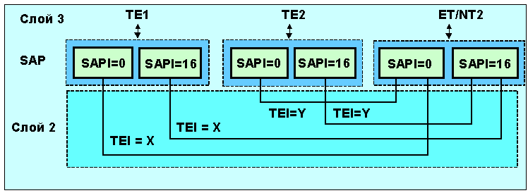 Рис. 4.3.3.9 Виртуальный интерфейс между слоями 2 и 3 Как видно из рисунка в системе могут использоваться и идентичные коды TEI, если они относятся к разным видам услуг (несовпадающими должны быть лишь комбинации SAPI-TEI). Для кодирования сигналов в ISDN используется метод 2B1Q (2 binary into 1 quaternary), что соответствует