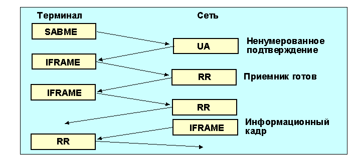 TEIс кодом в диапазоне 0-63 не нуждаются в диалоге с сетью в процессе установления связи на уровне 2. Но пользователь должен следить сам, чтобы в системе не было двух TEI с идентичными кодами. Терминалы с TEI в диапазоне 64-126 должны договариваться с сетью о TEI при установлении связи на уровне 2. Широковещательный TEI=127 служит для обращения ко всем терминалам, имеющим тот же код SAPI. Прежде чем предложить услуги уровню 3 уровень 2 должен запустить LAP. Это производится путем обмена пакетами между драйвером терминала уровня 2 и соответствующим сетевым драйвером. Предварительно должен быть активирован интерфейс уровня 1. До установления LAP возможен обмен только ненумерованными кадрами. Этот процесс включает в себя передачу команды SET asynchronous balanced mode extended(SABME), адресат при этом должен откликнуться посылкой ненумерованного отклика (UA - unnumbered acknowledgment). После установления канала уровень 2 может передавать информацию для уровня 3. Ниже (рис. 4.3.3.13) приведена последовательность обмена кадрами на уровне 2: