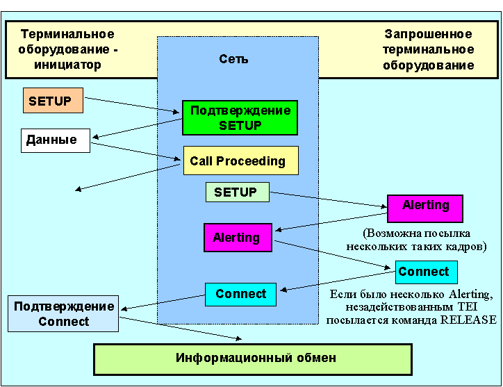 Рис. 4.3.3.18 Последовательность сообщений при реализации стандартного вызова Вызываемый партнер получает setup-сообщение через широковещательное обращение. Все терминалы, соединенные с NT1 могут анализировать Setup-сообщение с тем, чтобы определить, соответствуют ли они вызывающей стороне. Соответствие определяется по возможностям канала и по совместимости информационных элементов нижнего уровня. Если терминал соответствует требованиям запроса, он посылает сети сообщение alerting (Оповещение). В то же время, если необходимо, терминал должен сформировать локальный сигнал вызова (напр. звонок). После получения всей необходимой информации сеть выдает сообщение call proceeding, которое указывает на то, что начата установка связи с объектом вызова. Когда терминал обнаружил, что на запрос получен отклик, он переадресует connect-сообщение сети. Сеть регистрирует запрос и выдает команду терминалу соединиться с соответствующим B-каналом, послав пакет connect acknowledge, содержащий код B-канала. В любой момент времени к В-каналу может иметь доступ только один терминал. Все остальные терминалы, которые откликнулись на запрос, получат от сети сообщение release, которое переводит их в пассивное состояние. Пользователь может отменить запрос в любое время, послав три сообщения: disconnet, release и release complete (см. рис. 4.3.3.19 и таблица 4.3.3.2).