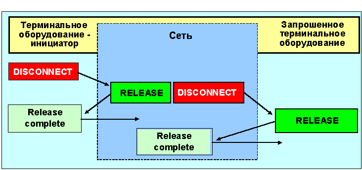 Рис. 4.3.3.19 Обмен сообщениями при разрыве связи Возможна временная пассивация терминала посредством сообщения suspend с последующим возобновлением прерванного режима с помощью сообщения resume. Каждое из этих сообщений требует подтверждения получения (suspend acknowledge и resume acknowledge, соответственно). При вызове может оказаться несколько терминалов, отвечающих запрашиваемым требованиям (например, телефонных аппаратов). Вызывающая сторона может выбрать один из них (зная, например, их положение). Существует два механизма обращения к заданному терминалу. Первый использует вспомогательную службу direct dialling-in (DDI), которая в случае реализации обычного доступа к ISDN называется multiple subscriber number (MSN). В DDI и MSN номер сети используется для целей маршрутизации в пределах локальной сети пользователя. Каждому терминалу в сети должен быть присвоен уникальный MSN-номер. Именно этот номер используется для идентификации при Setup-процедуре. Второй механизм адресации к заданному терминалу базируется на субадресации (subaddressing - SUB). В этом варианте дополнительная адресная информация передается от источника запроса к адресату. Этот адрес не является частью ISDN-номера, который используется для целей маршрутизации. Этот адрес может быть применен для обращения к некоторому процессу внутри терминала (не следует забывать, терминалом может быть ЭВМ) или к приложениям, которые не следуют стандартам OSI. Каждый терминал, подсоединенный к пассивной шине, нуждается в присвоении ему субадреса. Принципиальное различие между DDI/MSN и SUB методами адресации заключается в том, что для DDI/MSN адрес является частью ISDN номера, в то время как для SUB это не так. В этом случае каждому терминалу, подключенному к пассивной шине, должен быть присвоен такой субадрес. Процедура Setup должна содержать информацию о субадресе. Для выбора типа услуг и проверки терминальных возможностей используется обмен сообщениями alerting-connect. Для максимального удовлетворения запросов потребителей isdn должна поддерживать самые разные дополнительные виды услуг. Чтобы решить эти задачи на уровне 3 для интерфейса пользователь-сеть разработаны два протокола - функциональная и стимулирующая сигнальные процедуры. В случае стимулирующей сигнальной процедуры терминал не должен иметь какой-либо информации о вспомогательных видах услуг. Работа терминала контролируется сетью с помощью сигнальных сообщений уровня 3. Сеть и терминал работают по схеме клиент-сервер и от терминала не требуется особых аналитических способностей. Базовый формат управляющих сообщений соответствует типу information. Существуют две разновидности этого протокола: один использует управляющие последовательности символов, заключенные между * и #, для второго - сеть должна хранить специальный профайл для каждого терминала. Такой профайл может переопределять функцию некоторых клавиш терминала. Нажатие такой клавиши осуществляет вызов определенного вида услуг. В случае функциональной сигнальной процедуры терминал должен знать все о вспомогательном виде услуг и хранить всю необходимую информацию о них. Функциональный протокол использует информационные элементы facility (возможность, см. таблицу 4.3.5.4). Для пересылки этих информационных элементов используются сообщения типа register (см. описание протокола X.25). Функциональный протокол базируется на протоколе ROSE (r