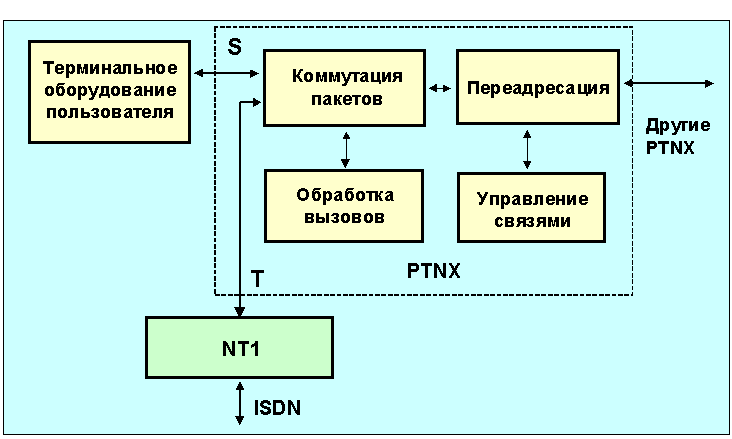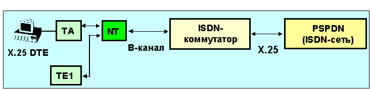 Рис. 4.3.3.21 Связи местной ISDN-АТС Взаимодействие между ISDN и PSPDN регулируется стандартом ccitt x.31 (и i.462). x.31 позволяет использовать ISDN с существующими сетями x.25. Схема взаимодействия периферийного оборудования, ISDN и PSPDN показана на рисунке 4.3.3.22 (ISDN-коммутатор может и отсутствовать).