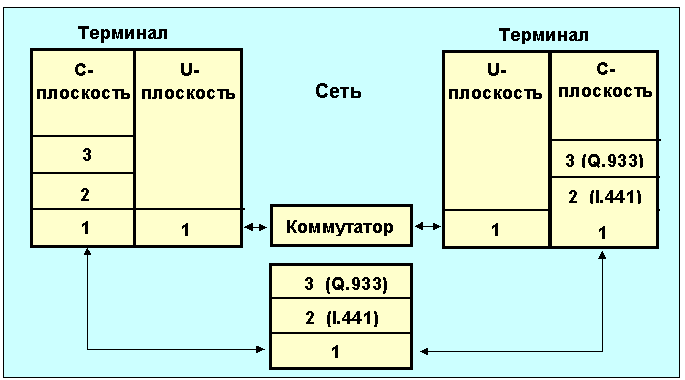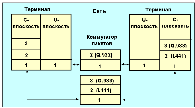 Рис. 4.3.3.23 Услуги ISDN в режиме переключения (цифрами помечены уровни протоколов, в скобках приведены ссылки на документы ITU) На сигнальном уровне C-плоскости используются стандартные LAPD-процедуры слоя 2 (Q.921 или I.441), а для слоя 3 спецификация кадрового режима (Q.933). Но на U-плоскости сеть поддерживает только небольшую часть связного протокола: