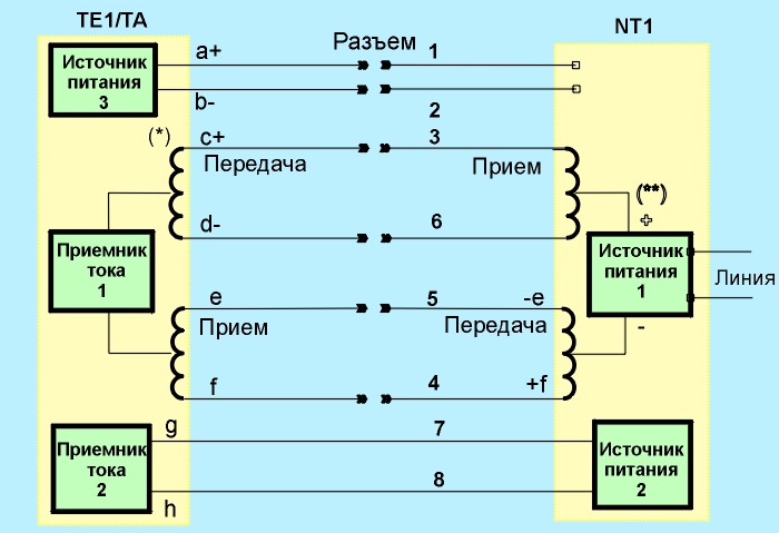 Эталонная конфигурация системы передачи и приема сигналов, а также подачи питания на терминальное оборудование показана на рис. 4.3.3.3. Передаваемая по проводам мощность составляет 1-0.5 Вт. Дополнительная пара проводов питания является в настоящее время опционной.