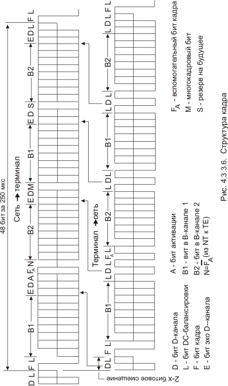 Рис. 4.3.3.5 Терминальный ISDN-интерфейс Нормальная амплитуда сигнала составляет 750 мВ. Формат кадра первого уровня показан на рис. 3.5.3.6, он содержит 48 бит и имеет длительность 250 мксек. Физическая скорость обмена составляет 192 Кбит/с (~5,2 мксек на бит). Блок-схема терминального ISDN-интерфейса показана на рис. 4.3.3.5. Питание интерфейса осуществляется через 4-проводный выходной кабель. На вход интерфейса подается импульсно-кодовый модулированный сигнал (ИКМ). Интерфейс обеспечивает доступ к B- и D-каналам. Номинальное смещение в начале кадра в случае обмена терминал-сеть, как показано на рис. 4.3.3.6, составляет 2 бита. В некоторых случаях оно может оказаться больше из-за задержек в кабеле. Кадр включает в себя несколько l-битов, которые служат для балансировки цуга по постоянному току. Для направления NT -> TE (связь сетевого оборудования с терминальным) первыми битами кадра являются F/L-пары (см. начало и конец диаграмм; временная ось направлена слева направо), нарушающие AMI-правила (чередование полярности сигнала при передаче логической единицы). Раз чередование нарушено, до завершения кадра должно присутствовать еще одно такое нарушение. Бит FA реализует это второе нарушение чередования полярности. A-бит используется в процедуре активации для того, чтобы сообщить терминалу о том, что система синхронизована. Активация может проводиться по инициативе терминала или сетевого оборудования, а деактивация может быть выполнена только сетью. Помимо B1, B2 (байты выделены стрелками) и D-каналов формируются также виртуальные E- и A-каналы. E-канал служит для передачи эхо от NT1 к TE в D-канале. Существует 10-битовое смещение (задержка) между D-битом, посылаемым терминалом, и E-битом эхо (отмечено стрелкой на рис. 4.3.3.6). M-бит используется для выделения мультифреймов (эта услуга недоступна в Европе). M-бит идентифицирует некоторые FA-биты, которые могут быть изъяты для того, чтобы сформировать канал управления (например, при проведении видеоконференций). S-бит является резервным. Назначения различных вспомогательных каналов собраны в таблице А. Таблица А