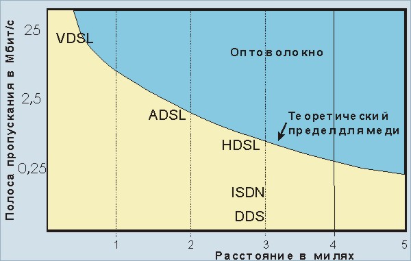 Верхние значения в третей колонке для ADSL и VDSL соответствуют нисходящему (асимметричный канал) и дуплексному потокам. HDTV - телевидение высокого разрешения.