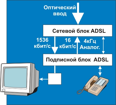 Рис. 4.3.7.5. Схема подключения телевизора и телефона через модем ADSL |
