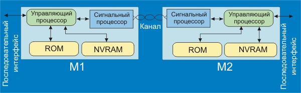 Само название этого прибора происходит от имеющихся в нем модулятора и демодулятора. Современный модем можно отнести к числу устройств с наибольшим числом современных технологий на кубический сантиметр. Разнообразие модемов огромно. Они различаются по конструкции, по используемым протоколам, по характеру интерфейсов и т.д. Основное назначение модема оптимальное преобразование цифрового сигнала в аналоговый для передачи его по каналу связи и, соответственно, обратное преобразование на принимающей стороне. Под "оптимальным преобразованием" понимается такое, которое обеспечивает надежность связи, улучшает отношение сигнал шум и как следствие пропускную способность канала. Это преобразование необходимо для обеспечения улучшения отношения сигнал-шум. В качестве канала передачи данных может быть использована городская телефонная сеть, выделенная линия или радио-канал. Схема взаимодействия модемов показана на рис. 4.3.7.1.
