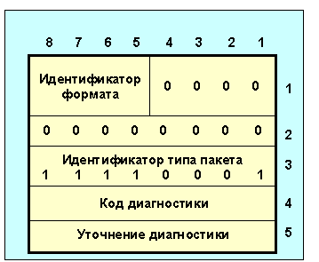 Рис. 4.3.2.12. Формат пакетов прерывание и подтверждение прерывания Идентификатор формата равен 0x1 для нумерации по модулю 8 и 0x2 при нумерации по модулю 128. Передав сообщение прерывание, DTE должно ожидать получение пакета подтверждение прерывания. Максимальный размер поля данные пользователя в пакете прерывание не должен превышать 32 байт. Иногда в сетях для сообщения об ошибке используется пакет "диагностика". Этот пакет посылается DCE, адресуется DTE и несет информацию о неустранимых на уровне пакетов ошибках. Пакет диагностика посылается лишь один раз сразу после выявления ошибки. Подтверждения его получения не требуется. Формат пакета показан на рис. 4.3.2.13.