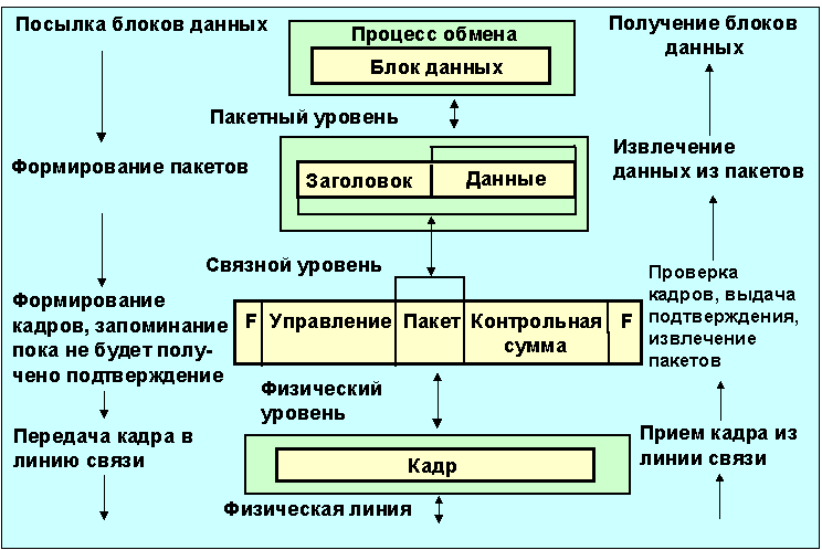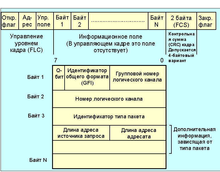 Рис. 4.3.2.2. Три уровня X.25 Формат кадра для протокола HDLC показан на рис. 4.3.2.3 (байты передаются, начиная с младшего бита):