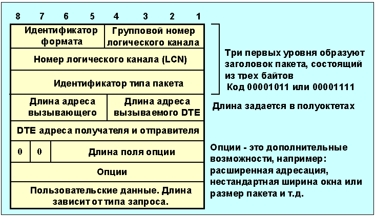 x - отмечет разряды, которые могут принимать значения 0 или 1. Четырехбитовые поля длина адреса отправителя и длина адреса получателя характеризуют длины последующих полей переменной длины. Длина выражается в полуоктетах. Далее следуют соответствующие адреса. В каждом полуоктете записывается десятичная цифра адреса, при необходимости поле адреса дополняется нулями до целого числа октетов. Для пакетов установления связи кадры имеют формат, показанный на рис. 4.3.2.4.