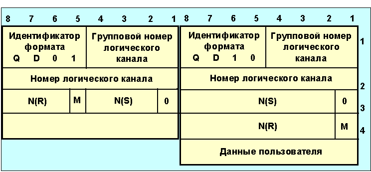 Рис. 4.3.2.8. Формат пакета подтверждения повторного пуска (слева) и повторной установки (справа) Пакеты данных передаются по постоянным виртуальным каналам или через виртуальные соединения после их создания. Пакеты данных распознаются по нулевому младшему биту (бит с номером 1) в третьем октете. Остальные биты этого октета используются для управления. Форматы пакетов данных показаны на рис. 4.3.2.9. Информационное поле начинается с четвертого байта (при расширенной нумерации с пятого) и может иметь длину 16-4096, хотя в рекомендациях стандарта x.25 оговорена величина 128 октетов. Если принимающая сторона не способна принять пакет данной длины, связь должна быть переустановлена, а стороне-инициатору соединения послано сообщение об ошибке. Каждому пакету данные присваивается порядковый номер N(S), значение которого при установлении соединения равно нулю.