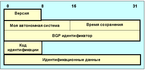 Рис. 4.4.11.4.2 Формат сообщения open Поле версия описывает код версии используемого протокола, на сегодня для BGP он равен 4. Двух-октетное поле моя автономная система определяет код AS отправителя. Поле время сохранения характеризует время в секундах, которое отправитель предлагает занести в таймер сохранения. После получения сообщения OPEN BGP-маршрутизатор должен выбрать значение времени сохранения. Обычно выбирается меньшее из полученного в сообщении open и значения, определенного при конфигурации системы (0-3сек). Время сохранения определяет максимальное время в секундах между сообщениями KEEPALIVE и UPDATE или между двумя UPDATE-сообщениями. Каждому узлу в рамках BGP приписывается 4-октетный идентификатор (BGP-identifier, задается при инсталляции и идентичен для всех интерфейсов локальной сети). Если два узла установили два канала связи друг с другом, то согласно правилам должен будет сохранен канал, начинающийся в узле, BGP-идентификатор которого больше. Предусмотрен механизм разрешения проблемы при равных идентификаторах. Одно-октетный код идентификации позволяет организовать систему доступа, если он равен нулю, маркер всех сообщений заполняется единицами, а поле идентификационных данных должно иметь нулевую длину. При неравном нулю коде идентификации должна быть определена процедура доступа и алгоритм вычисления кодов поля маркера. Длина поля идентификационных данных определяется по формуле: Длина сообщения = 29 + длина поля идентификационных данных. Сообщения типа UPDATE (изменения) используются для передачи маршрутной информации между BGP-партнерами. Этот тип сообщения позволяет сообщить об одном новом маршруте или объявить о закрытии группы маршрутов, причем объявление об открытии нового и закрытии старых маршрутов возможно в пределах одного сообщения. Сообщение UPDATE всегда содержит стандартный заголовок и может содержать другие поля в соответствии со схемой:
