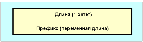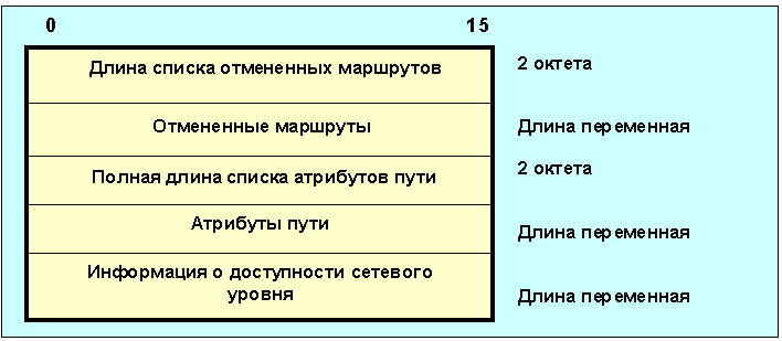 Рис. 4.4.11.4.3 Формат update-сообщения Если длина списка отмененных маршрутов равна нулю, ни один маршрут не отменен, а поле отмененные маршруты в сообщении отсутствует. Поле отмененные маршруты имеет переменную длину и содержит список IP-адресных префиксов маршрутов, которые стали недоступны. Каждая такая запись имеет формат: