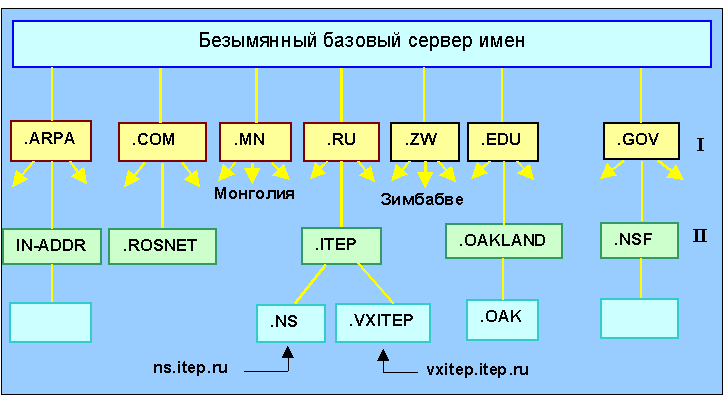 Рис. 4.4.12.2. Иерархия имен в Интернет-DNS (I - домен первого уровня; II - второго уровня) Каждому узлу (прямоугольнику на рисунке) соответствует имя, которое может содержать до 63 символов. Только самый верхний, корневой узел не имеет имени. При написании имени узла строчные и прописные символы эквивалентны. Имя домена, завершающееся точкой называется абсолютным или полным именем домена (например, itep.ru.). В некоторых странах создана структура имен сходная с com/edu/org. Так в Англии можно встретить адреса .ac.uk для академических учреждений и .co.uk - для коммерческих. Если имя домена не завершено символом точки, DNS может попытаться его дополнить, например имя ns может быть преобразовано в ns.itep.ru. На приведенной схеме каждому объекту трех верхних уровней соответствуют серверы имен, которые могут взаимодействовать друг с другом при решении задачи преобразования имени в IP-адрес. Можно было бы построить схему, при которой в любом сервере имен имелись адреса серверов .com, .edu, .ru и т.д. и при необходимости он мог бы послать туда запрос. Реальная схема серверов не столь идеальна и стройна - существуют серверы nsf.gov, oakland.edu и т.д., которые непосредственно связаны с базовым сервером имен. Каждый сервер содержит лишь часть дерева имен. Эта часть называется зоной ответственности сервера. DNS-сервер может делегировать ответственность за часть зоны другим серверам, создавая субзоны. Когда в зоне появляется новая ЭВМ или субдомен, администратор зоны записывает ее имя и IP-адреса в базу данных сервера. Администратор зоны определяет, какой из DNS-серверов имен является для данной зоны первичным. Число вторичных серверов не лимитировано. Первичный и вторичный серверы должны быть независимыми и работать на разных ЭВМ, так чтобы отказ одного из серверов не выводил из строя систему в целом. Отличие первичного сервера имен от вторичного заключается в том, что первичный загружает информацию о зоне из файлов на диске, а вторичный получает ее от первичного. Администратор вносит любые изменения в соответствующие файлы первичного сервера, а вторичные серверы получают эту информацию, периодически (раз в 3 часа) запрашивая первичный сервер. Пересылка информации из первичного во вторичные серверы имен называется зонным обменом. Как будет вести себя сервер, если он не имеет запрашиваемой информации? Он должен взаимодействовать с корневыми серверами. Таких серверов насчитывается около десяти и их IP-адреса должны содержаться в конфигурационных файлах. Список корневых серверов вы можете получить с помощью анонимного ftp по адресам: nic.ddn.mil или ftp.rs.internic.net . Корневые серверы хранят информацию об именах и адресах всех серверов доменов второго уровня. Существует два вида запросов: рекурсивные и итеративные. Первый вид предполагает получение клиентом IP-адреса, а второй - адреса сервера, который может сообщить адрес. Первый вид медленнее, но дает сразу IP-адрес, второй эффективнее - в вашем сервере копится информация об адресах серверов имен. Одним из способов повышения эффективности трансляции имен в адреса является кэширование, то есть хранение в оперативной памяти имен-адресов, которые использовались последнее время особенно часто. Рассмотрение процесса обмена между ЭВМ-клиентом и сервером имен может прояснить работу системы в целом. Прежде чем использовать протоколы UDP или TCP прикладн
