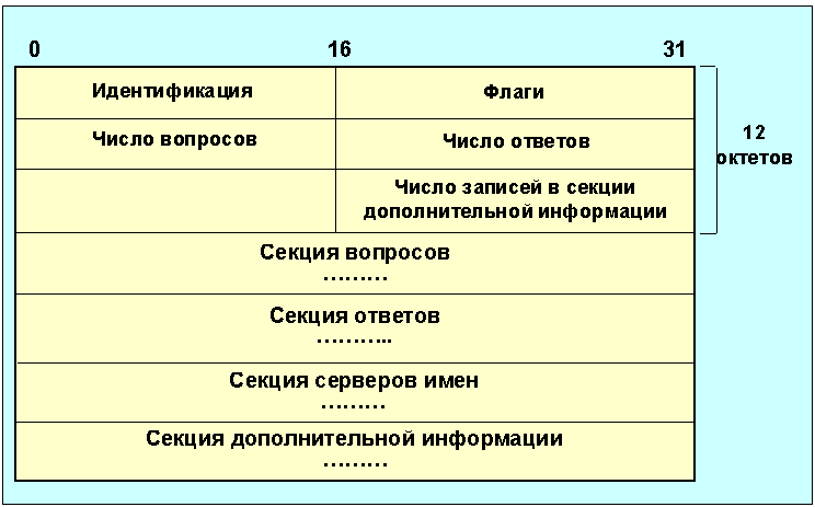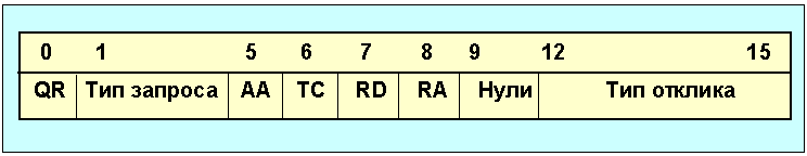 Рис. 4.4.12.3. Формат dns-сообщений Каждое сообщение начинается с заголовка, который содержит поле идентификация, позволяющее связать в пару запрос и отклик. Поле флаги определяет характер запрашиваемой процедуры, а также кодировку отклика. Поля число... определяют число записей соответствующего типа, содержащихся в сообщении. Так число вопросов задает число записей в секции вопросов, где записаны запросы, требующие ответов. Каждый вопрос состоит из символьного имени домена, за которым следует тип запроса и класс запроса. Значения битов поля флаги в сообщении сервера имен отображены в таблице 4.4.12.2. Разряды пронумерованы слева направо, начиная с нуля рис. 4.4.12.4.