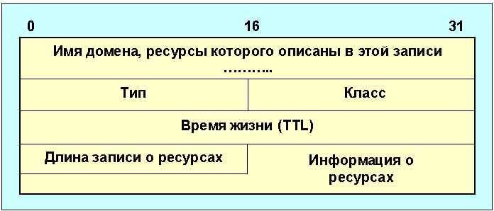 (Пропущенные коды являются устаревшими или экспериментальными). Последние две строки в таблице 4.4.12.3 относятся только к вопросам. Поле класс запроса позволяет использовать имена доменов для произвольных объектов (все официальные имена Интернет относятся к одному классу [IN] - 1). В сообщении DNS-сервера каждая из секций (дополнительной информации, ответов или узловых серверов имен) состоит из набора ресурсных записей, которые описывают имена доменов и некоторую другую информацию (например, их адреса). Появление ресурсных полей в DNS базе данных придают ей новые качества. Каждая запись описывает только одно имя, формат этих записей отображен на рис. 4.4.12.6.