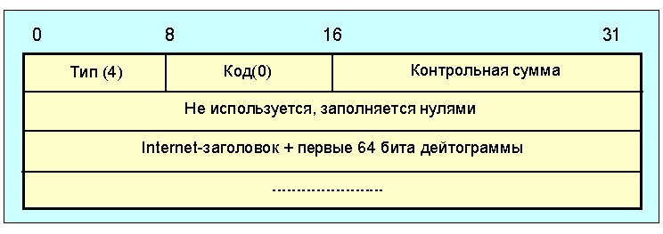 Рис. 4.4.4.3. Формат ICMP-сообщения "адресат не достижим" Поле код содержит целое число, проясняющее положение дел. Перечень кодов таких сообщений помещена в таблице 4.4.4.1. Поле MTU на следующем этапе характеризует максимальную длину пакетов на очередном шаге пересылки. Так как в сообщении содержится Интернет-заголовок и первые 64-бита дейтограммы, легко понять, какой адрес оказался недостижим. Этот тип ICMP-сообщения посылается и в случае, когда дейтограмма имеет флаг DF=1 ("не фрагментировать"), а фрагментация необходима. В поле код в этом случае будет записано число 4. Если буфер приема сообщения переполнен, ЭВМ посылает сообщение типа 4 для каждого из не записанных в буфер сообщений. Так как собственные часы различных ЭВМ имеют свое представление о времени, протокол ICMP, среди прочего, служит для синхронизации работы различных узлов, если это требуется (запросы временных меток). Протокол синхронизации NTP (network time protocol) описан в RFC-1119. Когда дейтограммы поступают слишком часто и принимающая сторона не справляется с этим потоком, отправителю может быть послано сообщение с требованием резко сократить информационный поток (quench-запрос), снижение потока должно продолжаться до тех пор, пока не прекратятся quench-запросы. Такое сообщение имеет формат: