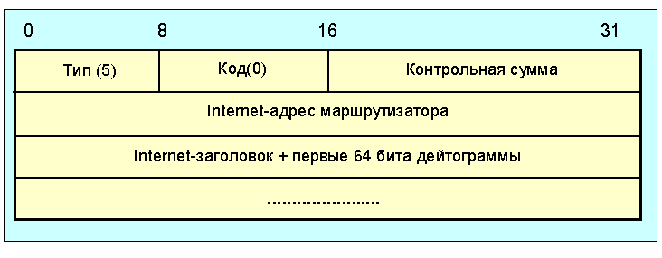 Рис. 4.4.4.4. Формат icmp-запроса снижения загрузки В Internet таблицы маршрутизации остаются без изменений достаточно долгое время, но иногда таблицы все же меняются. Если маршрутизатор обнаружит, что ЭВМ использует неоптимальный маршрут, он может послать ей ICMP-запрос переадресации. Формат такого сообщения отображен на рисунке 4.4.4.5.