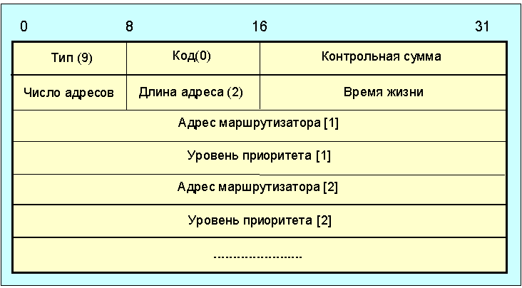 Рис. 4.4.4.6. Формат ICMP-сообщений об имеющихся маршрутах Поле число адресов характеризует количество адресных записей в сообщении. Поле длина адреса содержит число 32-битных слов, необходимых для описания адреса маршрутизатора. Поле время жизни предназначено для записи продолжительности жизни объявленных маршрутов (адресов) в секундах. По умолчанию время жизни равно 30 мин. Поля уровень приоритета представляют собой меру приоритетности маршрута по отношению к другим маршрутам данной подсети. Чем больше этот код тем выше приоритет. Маршрут по умолчанию имеет уровень приоритета 0. Формат запроса маршрутной информации (8 октетов, рис. 4.4.4.7).