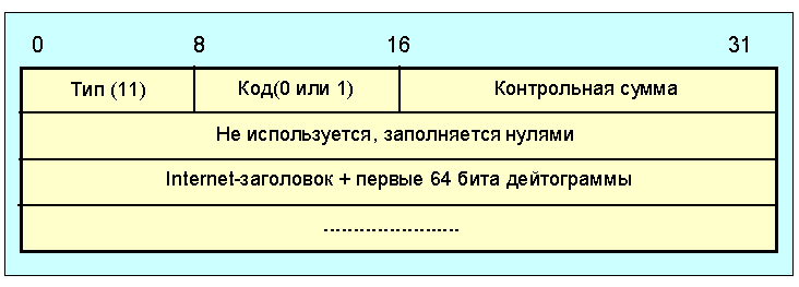 Рис. 4.4.4.7 Формат запроса маршрутной информации Так как следующий прогон (hop) дейтограммы определяется на основании локальной маршрутной таблицы, ошибки в последней могут привести к зацикливанию пакетов. Для подавления таких циркуляций используется контроль по времени жизни пакета (TTL). При ликвидации пакета по истечении TTL маршрутизатор посылает отправителю сообщение "время истекло", которое имеет формат (рис. 4.4.4.8):