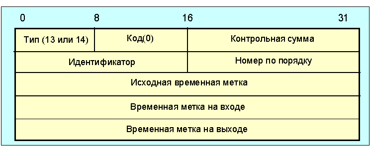Рис. 4.4.4.10. Формат ICMP-запроса временной метки Поле тип=13 указывает на то, что это запрос, а тип=14 - на то, что это отклик. Поле идентификатор и номер по порядку используются отправителем для связи запроса и отклика. Поле исходная временная метка заполняется отправителем непосредственно перед отправкой пакета. Поле временная метка на входе заполняется маршрутизатором при получении этого пакета, а Временная метка на выходе - непосредственно перед его отправкой. Именно этот формат используется в процедурах ping и traceroute. Эти процедуры позволяют не только диагностировать, но и оптимизировать маршруты. Например, команда traceroute cernvm.cern.ch, выданная в ЭВМ SUN (ИТЭФ), может отобразить на экране (в скобках указаны IP-адреса узлов и значения времени жизни дейтограмм, значения RTT приводится в миллисекундах):