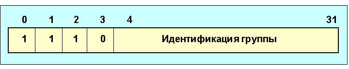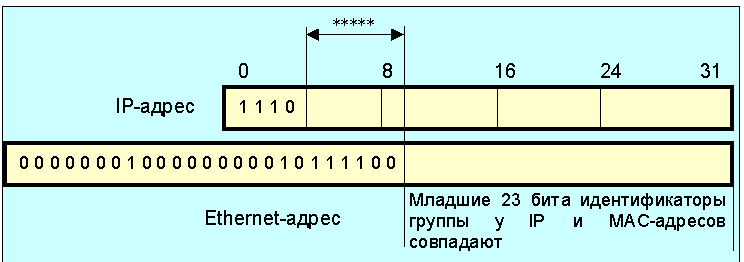 Рис. 4.4.9.1. Соотношение мультикастинговых MAC- и IP-адресов Область из 5 бит в IP-адресе, отмеченная *****, не используется при формировании Ethernet-адреса. Так как соотношение IP и MAC-адресов не является однозначным, драйверы должны обеспечивать обработку адресов с тем, чтобы интерфейсы получали только те кадры, которые действительно им предназначены. Для того чтобы информировать маршрутизатор о наличии участников мультикастинг-обмена в субсети, связанной с тем или иным интерфейсом, используется протокол IGMP. Протокол IGMP (internet group management protocol, RFC-1112) используется для видеоконференций, передачи звуковых сообщений, а также группового исполнения команд различными ЭВМ. Этот протокол использует групповую адресацию (мультикастинг). Групповая форма адресации нужна тогда, когда какое-то сообщение или последовательность сообщений необходимо послать нескольким (но не всем) адресатам одновременно. При этой форме адресации ЭВМ имеет возможность выбрать, хочет ли она участвовать в этой процедуре. Когда группа ЭВМ хочет взаимодействовать друг с другом, используется один групповой (мультикастинг) адрес. Групповая адресация может рассматриваться как обобщение обычной системы адресов, а традиционный IP-адрес - частный случай группового обращения при числе ЭВМ, равном 1. При групповой адресации один и тот же пакет может быть доставлен заданной группе ЭВМ. Членство в этой группе может динамично меняться со временем. Любая ЭВМ может войти в группу и выйти из группы в любое время по своей инициативе. В то же время ЭВМ может быть членом большого числа таких групп. ЭВМ может посылать пакеты членам группы, не являясь им сама. Каждая группа имеет свой адрес класса D (рис. 4.4.9.2, см. также рис. 4.4.9.1).