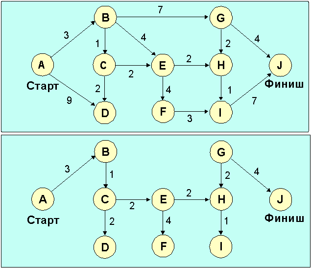 Протокол OSPF (Open Shortest Pass First, RFC-1245-48, RFC-1583-1587, алгоритмы предложены Дикстрой) является альтернативой RIP в качестве внутреннего протокола маршрутизации. OSPF представляет собой протокол состояния маршрута (в качестве метрики используется - коэффициент качества обслуживания). Каждый маршрутизатор обладает полной информацией о состоянии всех интерфейсов всех маршрутизаторов (переключателей) автономной системы. Протокол OSPF реализован в демоне маршрутизации gated, который поддерживает также RIP и внешний протокол маршрутизации BGP. Автономная система может быть разделена на несколько областей, куда могут входить как отдельные ЭВМ, так и целые сети. В этом случае внутренние маршрутизаторы области могут и не иметь информации о топологии остальной части AS. Сеть обычно имеет выделенный (designated) маршрутизатор, который является источником маршрутной информации для остальных маршрутизаторов AS. Каждый маршрутизатор самостоятельно решает задачу оптимизации маршрутов. Если к месту назначения ведут два или более эквивалентных маршрута, информационный поток будет поделен между ними поровну. Переходные процессы в OSPF завершаются быстрее, чем в RIP. В процессе выбора оптимального маршрута анализируется ориентированный граф сети. Ниже описан алгоритм Дикстры по выбору оптимального пути. На иллюстративном рис. 4.2.11.2.1 приведена схема узлов (A-J) со значениями метрики для каждого из отрезков пути. Анализ графа начинается с узла A (Старт). Пути с наименьшим суммарным значением метрики считаются наилучшими. Именно они оказываются выбранными в результате рассмотрения графа ("кратчайшие пути").