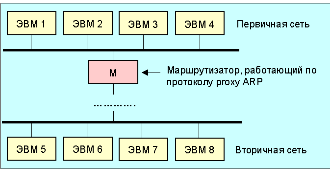 Еще одна разновидность протокола ARP служит для того, чтобы один и тот же сетевой префикс адреса можно было использовать для двух сетей. Этот протокол называется смешанным протоколом ARP (proxy). Предположим, мы имеем сеть из четырех ЭВМ (1-4; рис. 4.4.7.1), которую бы мы хотели соединить с другой сетью из четырех ЭВМ (5-8), причем так, чтобы машины взаимодействовали друг с другом так, будто они принадлежат одной сети. Решить эту проблему можно, соединив эти сети через маршрутизатор M, работающий в соответствии со смешанным протоколом ARP (функционально это IP-мост). Маршрутизатор знает, какая из машин принадлежит какой физической сети. Он перехватывает широковещательные ARP-запросы из сети 1, относящиеся к сети 2, и наоборот. Во всех случаях в качестве физического адреса маршрутизатор возвращает свой адрес. В дальнейшем, получая дейтограммы, он маршрутизирует их на физические адреса по их IP-адресам.