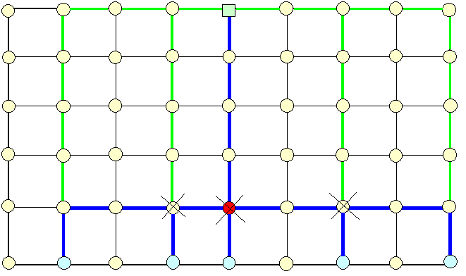 Протокол PIM (Protocol Independent Multicast) призван решить проблемы маршрутизации для произвольного числа и расположения членов группы и для произвольного числа отправителей информации. В настоящее время протокол не является стандартом. Главным преимуществом данного протокола является эффективная поддержка работы "рассеянных" мультикастинг-групп. Такие группы могут включать не только членов из разных автономных систем, но и находящихся на разных континентах. Протоколы MOSPF и DVMRP хороши для сетей, где нет ограничений по пропускной способности каналов. PIM базируется на традиционных маршрутных протоколах, конкретно не связан ни с каким из них, им используются сформированные этими протоколами маршрутные таблицы. Существует два режима работы протокола - DM (для компактных групп) и SM (Protocol Independent Multicast-Sparse Mode (PIM-SM)). Protocol Specification. D. Estrin, D. Farinacci, A. Helmy, D. Thaler, S. Deering, M. Handley, V. Jacobson, C. Liu, P. Sharma, L. Wei, RFC-2117, June 1997) (для рассеянных групп). В режиме DM протокол PIM строит дерево маршрутов аналогично DVMRP. В режиме SM маршрутизаторы, имеющие членов мультикастинг-группы, посылают сообщения о присоединении к дереву рассылки в узлы, которые называются точками встречи (RP). Отправители используют RP для объявления о своем существовании, а получатели, чтобы узнать о новых отправителях. В качестве RP может использоваться любой маршрутизатор, поддерживающий протокол PIM. Когда какой-то клиент хочет подключиться к некоторой группе, ближайший к нему маршрутизатор посылает специальное сообщение о включении в группу (PIM-joint) узлу, объявленному для данной группы точкой встречи (RP). Число RP в сети может быть произвольным. Узел RP пересылает сообщение о включении узлу-отправителю (или отправителям). Если маршрутизатор не имеет информации о RP, включается схема, работающая для компактных групп. При обработке сообщения о включении в группу промежуточные маршрутизаторы формируют часть дерева мультикастинг-маршрутов между RP и получателем. При отправке мультикастинг-пакета соответствующий маршрутизатор посылает узлу RP регистрационное сообщение (PIM-register), куда вкладывается информационный пакет. Если используется несколько RP, отправитель должен посылать пакеты всем RP. Получатель же должен быть подключен лишь к одному из RP. В случае, когда сообщение о включении достигнет отправителя раньше, чем RP, подключение осуществляется, минуя RP. Если необходимо оптимизировать дерево доставки пакетов, маршрутизаторы-получатели должны послать сообщение о включении самому отправителю. После этого дерево соединений видоизменяется, некоторыми узлами, если требуется, посылается сообщение об отключении. Ниже приведен пример взаимодействия узлов при формировании дерева маршрутов в режиме SM-PIM (рис. 4.4.9.5.1). Следует заметить, что большинство протоколов для маршрутизации мультимедийной информации формируют маршрут не от отправителя к получателю, а в обратном направлении. Это имеет под собой веские причины. Дерево рассылки должно быть построено так, чтобы поток отправителя как можно дольше и меньше разветвлялся. Желательно, чтобы разветвления происходили как можно ближе к получателю. Это соображение проиллюстрировано на рис. 4.4.9.5.2. На рисунке условно, в виде сетки маршрутизаторов (желтые кружочки) показан фрагмент сети Интернет. Зеленым прямоугольником отмечен передатчик, а голубыми кружочками приемники