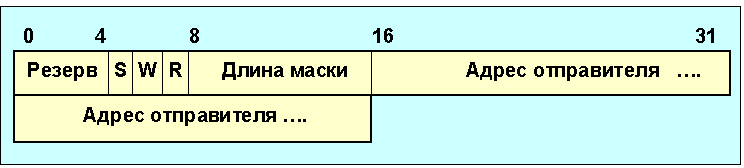 Рис. 4.4.9.5.4. Формат закодированного группового адреса Поле длина маски имеет 8 бит. Значение поля определяет число последовательных бит, выровненных по левому краю, которые определяют адрес. Маска равна или меньше длины адреса * 8 (то есть 32 бита для IPv4 и 128 для IPv6). Поле групповой мультикаст адрес содержит адрес группы и имеет число байт, равное указанному в поле длина адреса. Формат кодированного адреса отправителя показан на рис. 4.4.9.5.5.